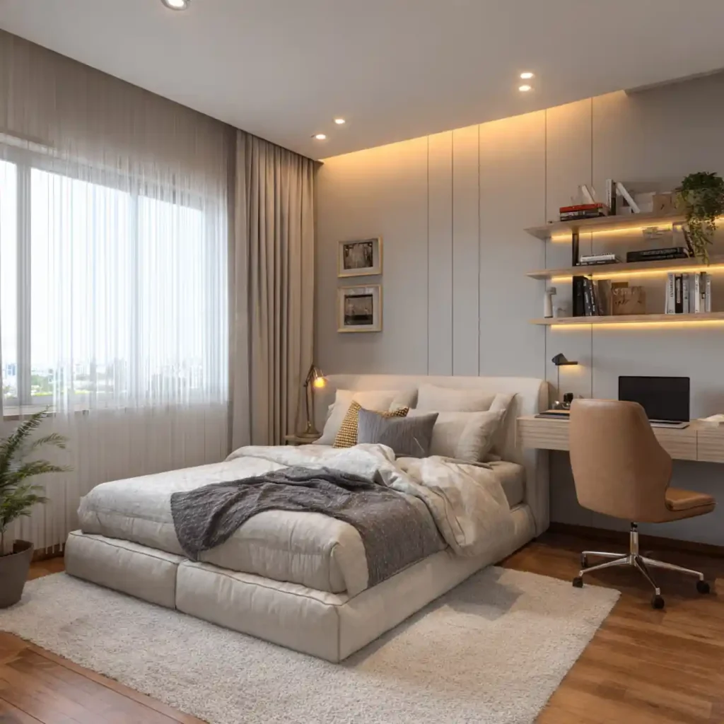 A small office corner is integrated into the bedroom layout. A neat desk and chair create a productive workspace. The bed area stays separate and relaxing. Soft lighting supports both work and rest. This room serves two purposes smoothly.