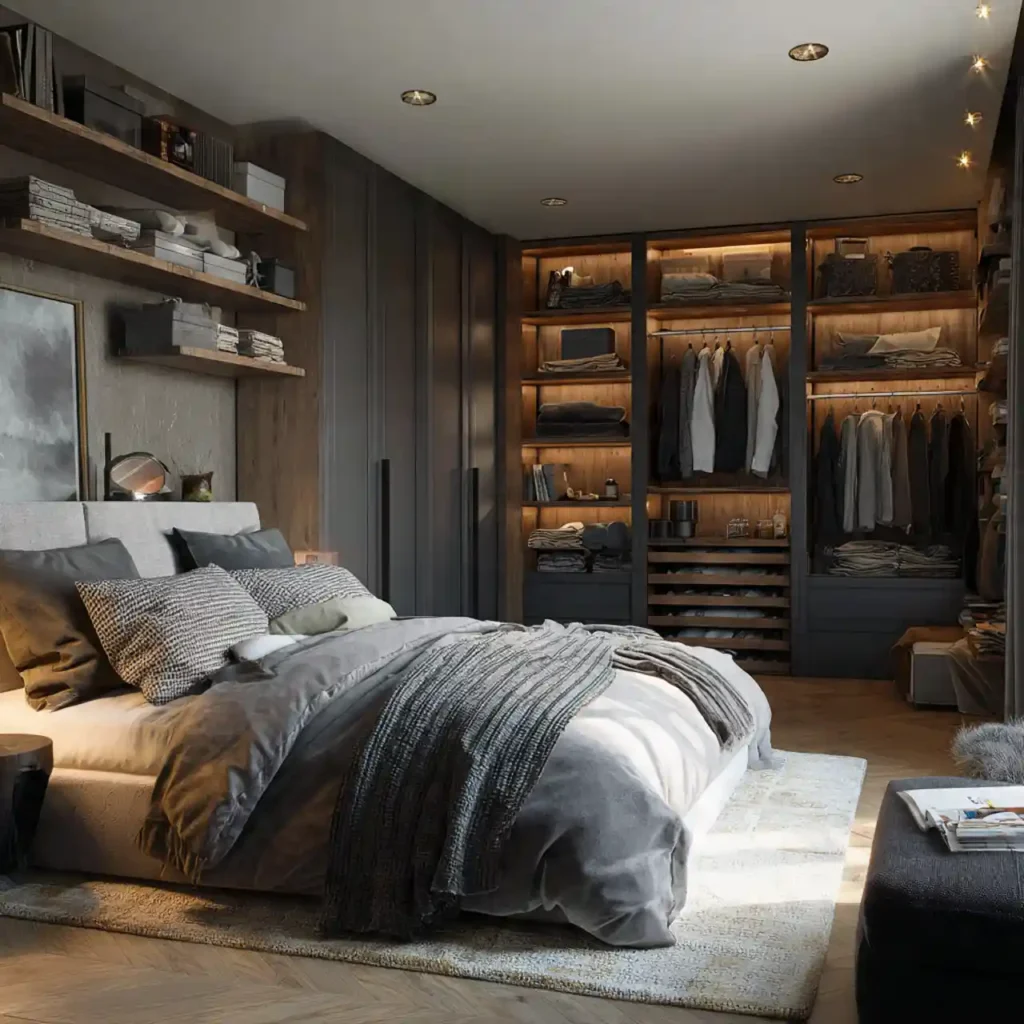 A large wardrobe is combined with a small dressing area. Mirrors and drawers support daily routines. The bed stays as the cozy center of the room. Storage keeps everything organized and accessible. Function and style work together perfectly.