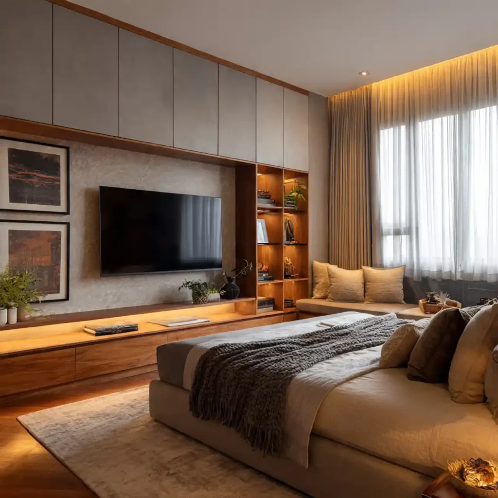 A TV unit is placed opposite the bed for entertainment. Storage cabinets hold gadgets and accessories. Lighting is balanced for both viewing and sleeping. The room becomes a personal relaxation hub. Comfort meets smart functionality.