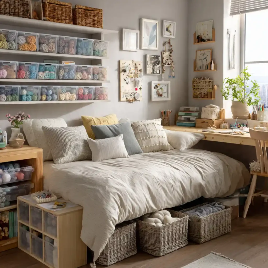 A small crafting or hobby table is added beside the bed. Storage bins hold creative supplies neatly. The room supports both passion and rest. Décor remains simple and organized. This bedroom encourages creativity and comfort.
