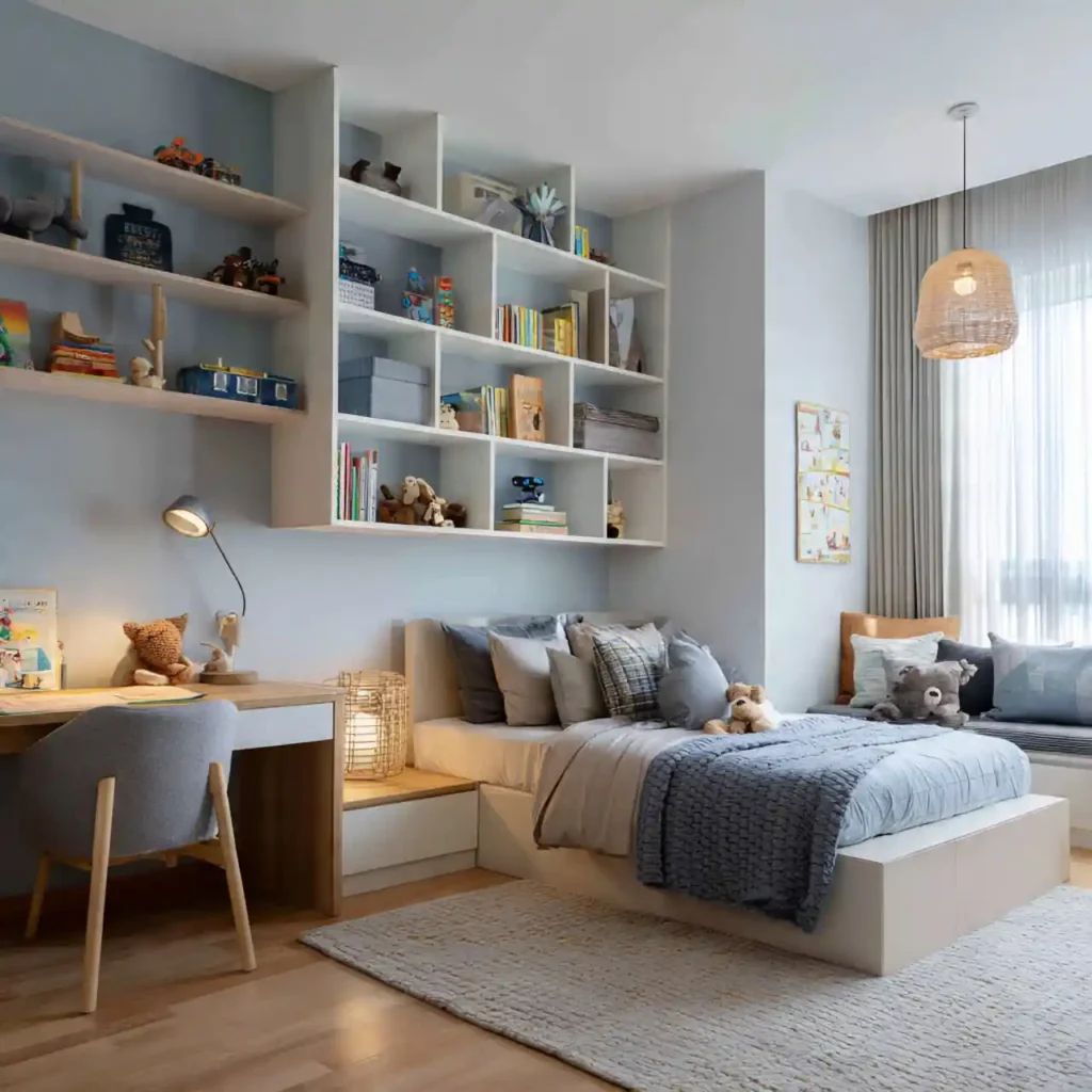 The bedroom includes a study desk for schoolwork. Storage shelves organize books and toys. The bed stays cozy and fun. Bright but soft colors keep the space lively. It becomes a perfect multi-use kids room.