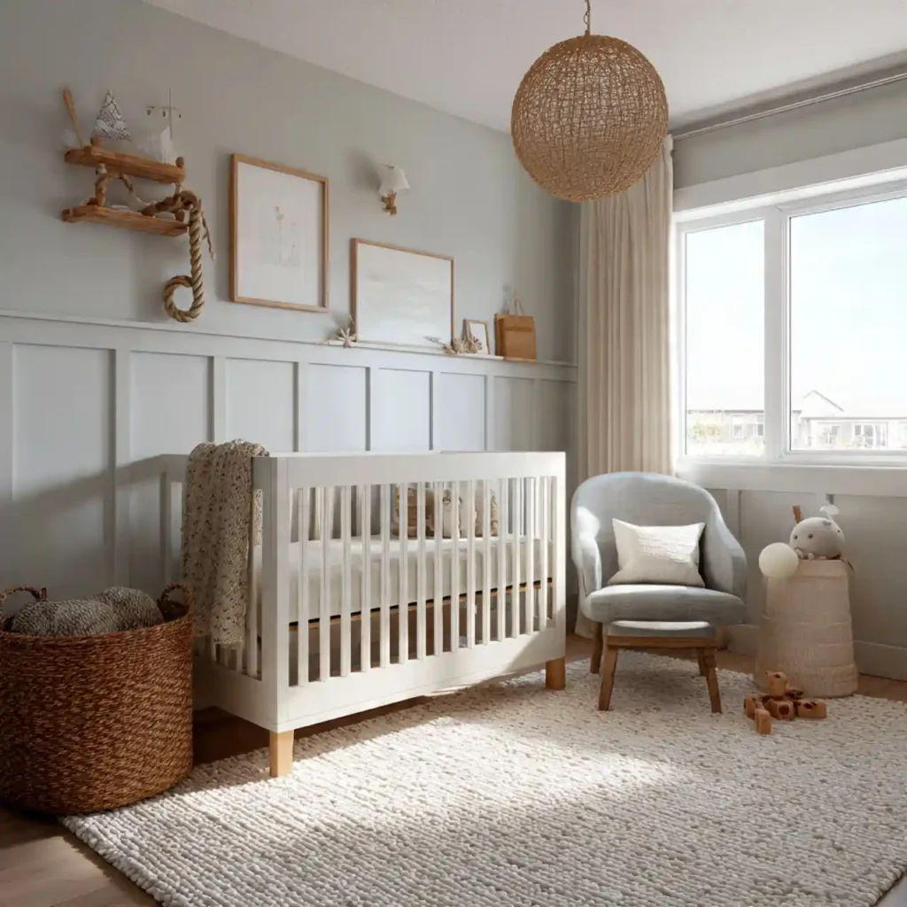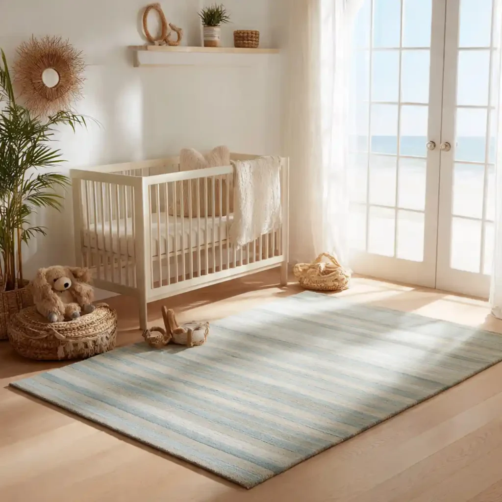 Natural fiber rugs like jute or cotton bring warmth and texture into the nursery. Their soft tones blend perfectly with coastal colors. Large rugs help unify the room and define the space. They also provide comfort underfoot. This detail enhances both style and functionality.