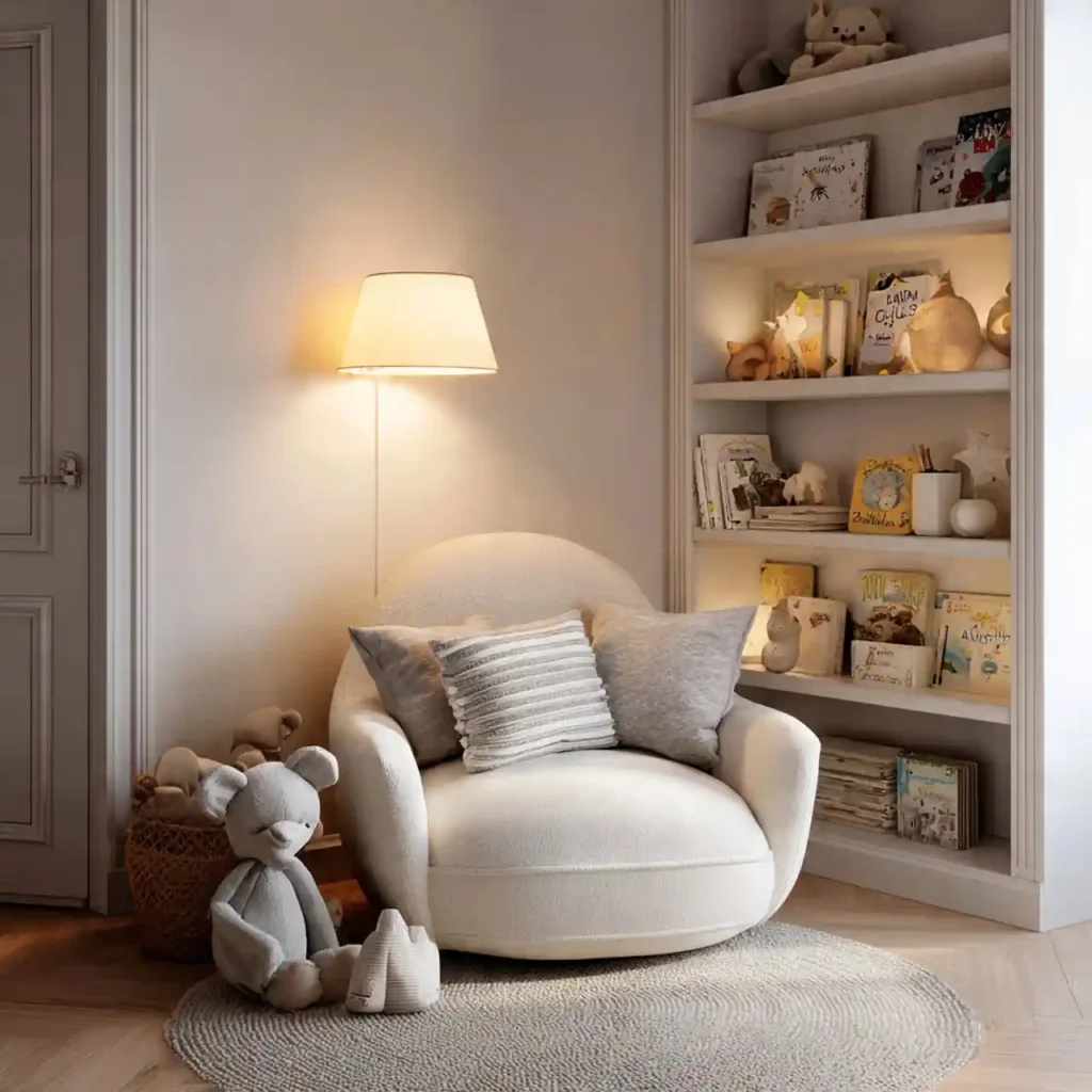 Creating a small reading corner adds both comfort and function to the nursery. A soft chair with cushions provides a relaxing spot for parents and baby. Neutral tones maintain a calm aesthetic. Adding a few books enhances the cozy atmosphere. This corner feels warm and personal.