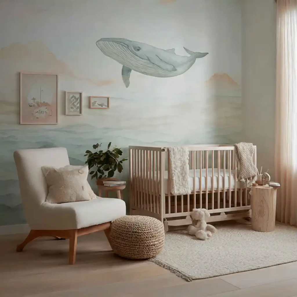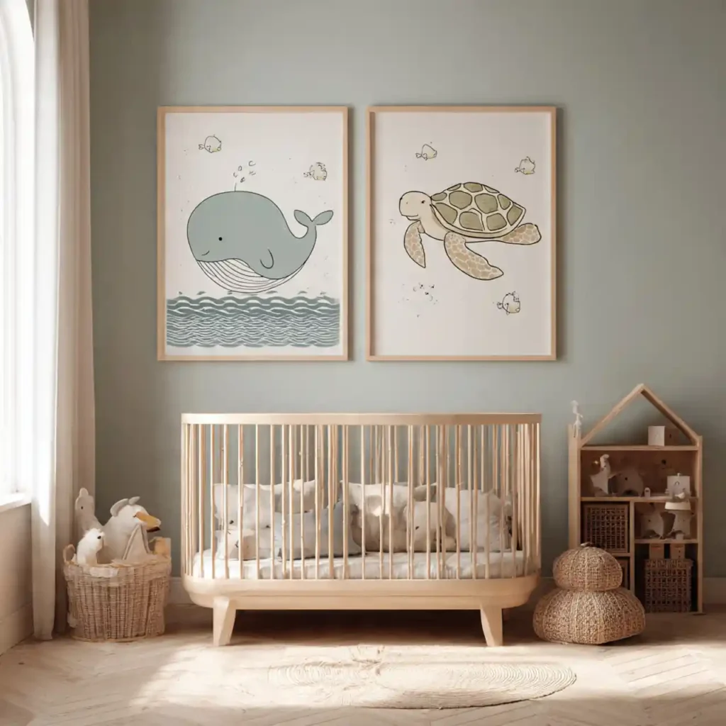 Gentle ocean-themed artwork featuring whales, turtles, or fish adds a playful yet calming touch. Soft illustrations keep the visuals soothing for a baby’s environment. Choosing larger pieces instead of many small ones keeps the design clean. Neutral or pastel tones ensure harmony with the rest of the room. This detail adds charm without overwhelming the space.
