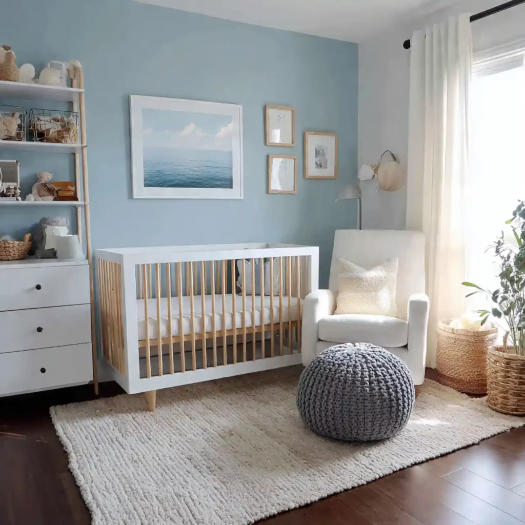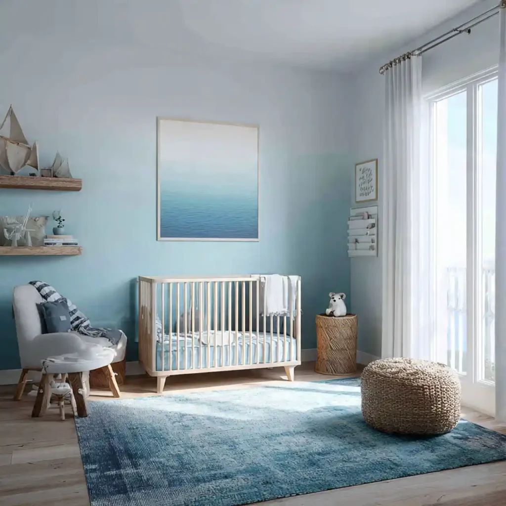 A soft blue and white color palette instantly creates a calm and refreshing ocean-inspired atmosphere. These shades reflect natural light beautifully, making the nursery feel bright and airy throughout the day. Layering different tones of blue adds subtle depth without making the space feel heavy. White elements help maintain a clean and peaceful look. This combination sets a perfect foundation for a coastal nursery.