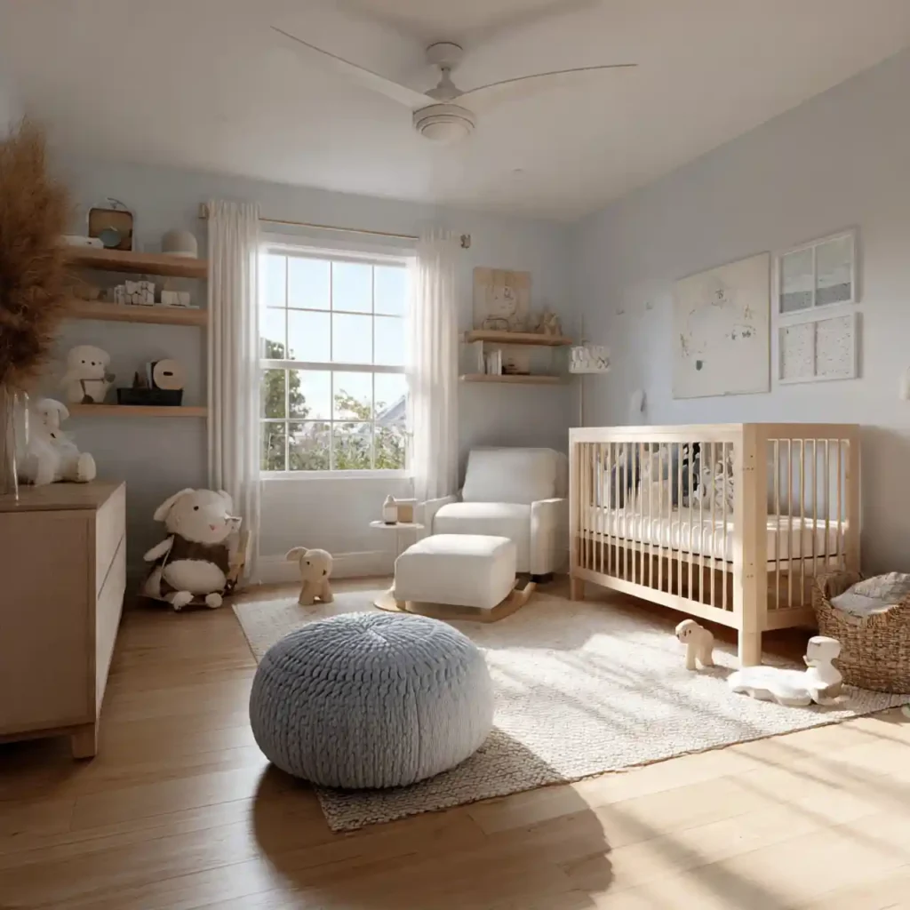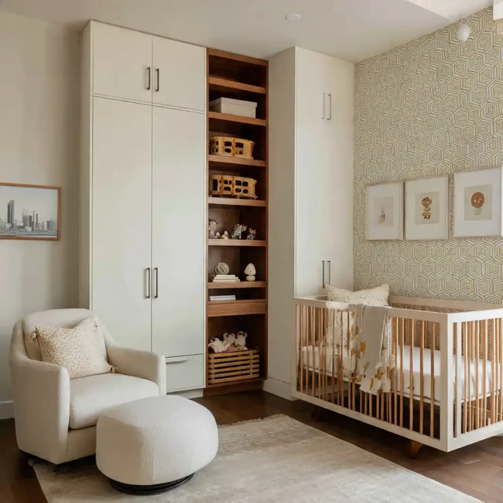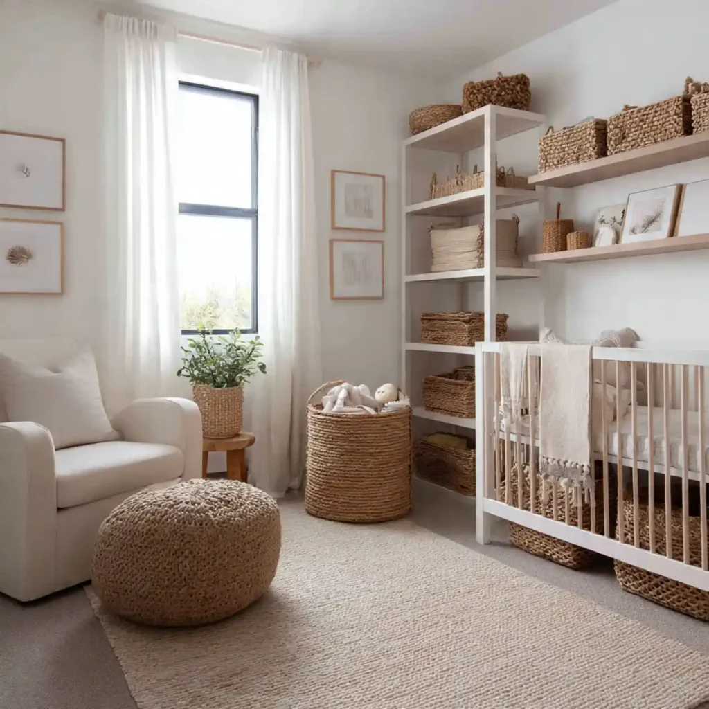 Simple storage solutions help keep the nursery organized and clutter-free. Hidden storage maintains a clean look. Neutral finishes blend seamlessly with the design. Keeping items out of sight enhances calmness. This creates a peaceful environment.