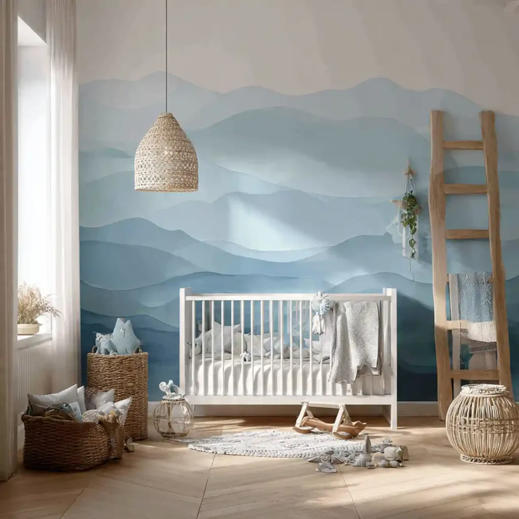 A wall designed with soft wave patterns introduces gentle movement into the room. The curved shapes feel natural and relaxing, similar to the motion of ocean waves. Using light tones ensures the design remains soothing rather than overwhelming. This feature wall can act as a subtle focal point without dominating the space. It brings a quiet coastal charm into the nursery.