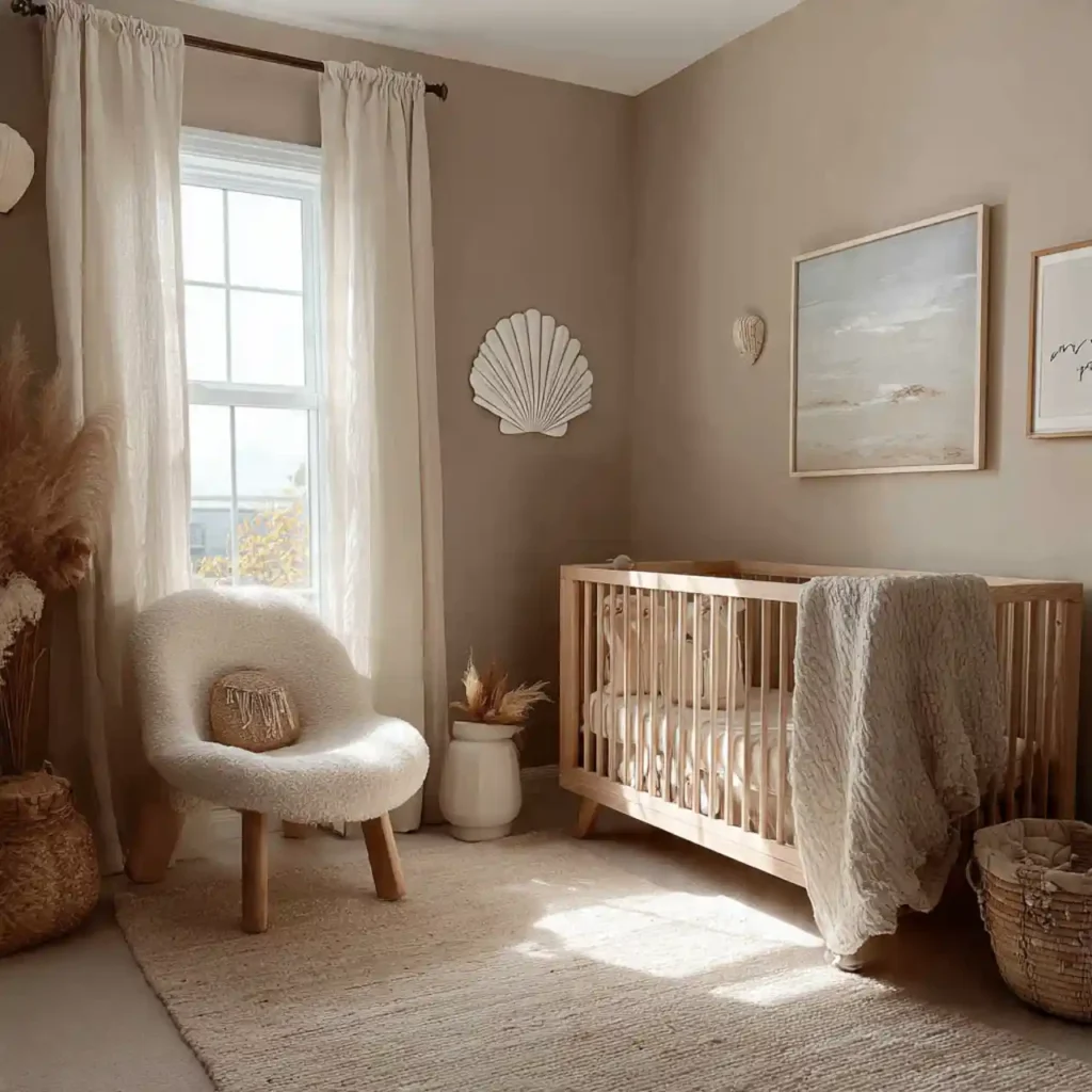 Sheer curtains allow natural light to filter softly into the nursery. The gentle movement of the fabric adds a dreamy and calming effect. Light tones help maintain an airy and open feel. They also soften the overall look of the room. This simple addition enhances the coastal atmosphere beautifully.