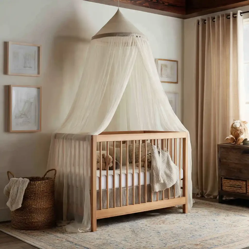 A light fabric canopy creates a dreamy and cozy look around the crib. Soft materials enhance comfort visually. Neutral tones maintain calmness. The design feels gentle and safe. This adds a magical touch to the nursery.