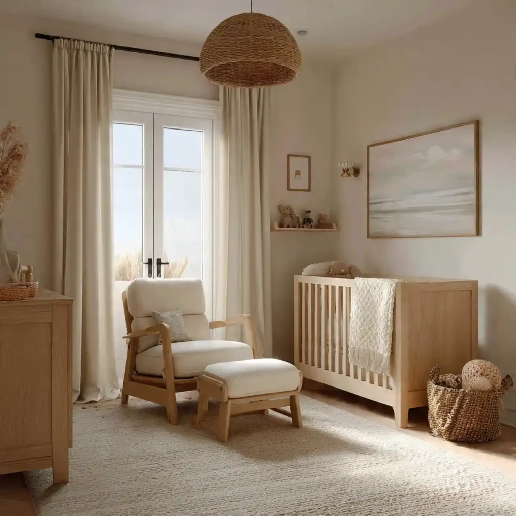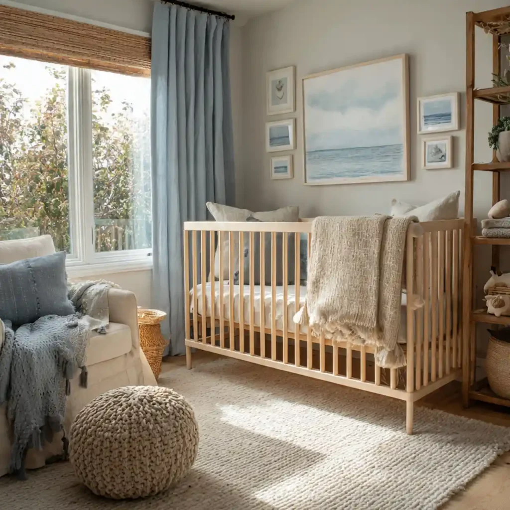 A light wood crib adds warmth and a natural touch to the nursery design. The soft wood tones complement coastal colors beautifully. Its simple design keeps the focus on comfort and safety. Pairing it with neutral bedding enhances the overall softness of the room. This setup feels cozy, clean, and timeless.