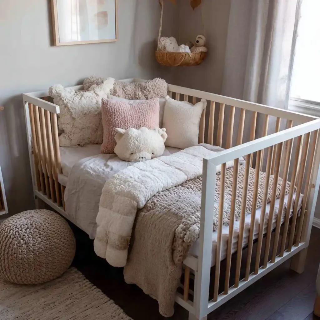 Layering bedding with soft blankets and cushions creates a cozy and inviting crib setup. Using neutral or pastel tones keeps the look calm and gentle. Different textures add depth without visual clutter. Comfort and safety should always remain the priority. This makes the nursery feel warm and nurturing.
