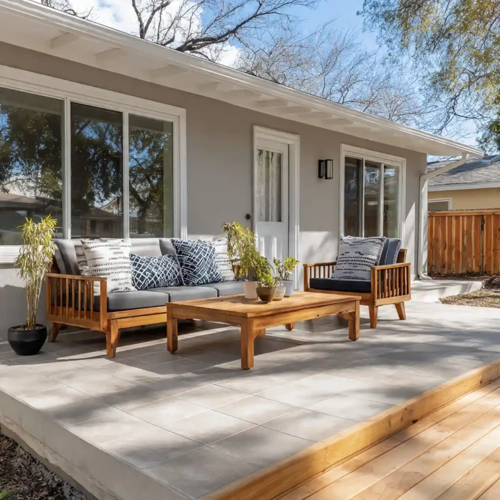 Adding a patio or seating space increases functionality. Simple outdoor furniture makes the house inviting. Decking or tiles define the area beautifully. It enhances lifestyle and property value. Old homes feel more modern and usable.