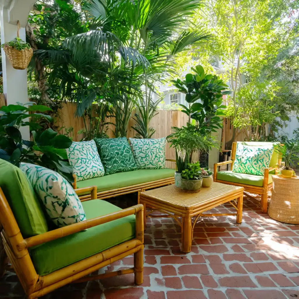 Large leafy plants create a tropical environment. Bamboo furniture enhances the natural theme. Bright cushions add lively colors. Organic materials keep the design fresh. This patio feels like a peaceful holiday escape.