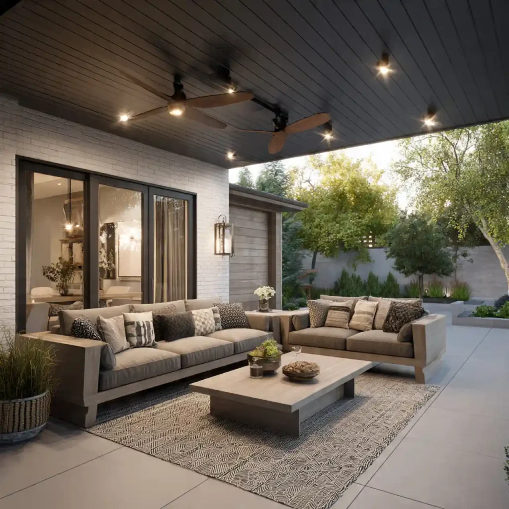 A covered roof makes the patio usable all year. Comfortable sofas improve relaxation. Ceiling fans provide airflow on warm days. Stylish lighting fixtures add beauty. This design is practical and highly functional.