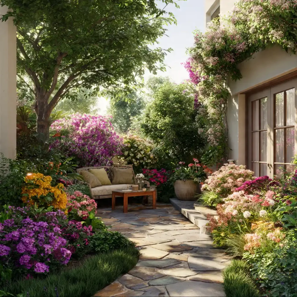 A patio surrounded by flowers looks fresh and vibrant. Nature becomes part of the living space. Stone pathways connect the patio beautifully. Soft seating keeps the atmosphere balanced. This idea feels calm and refreshing.