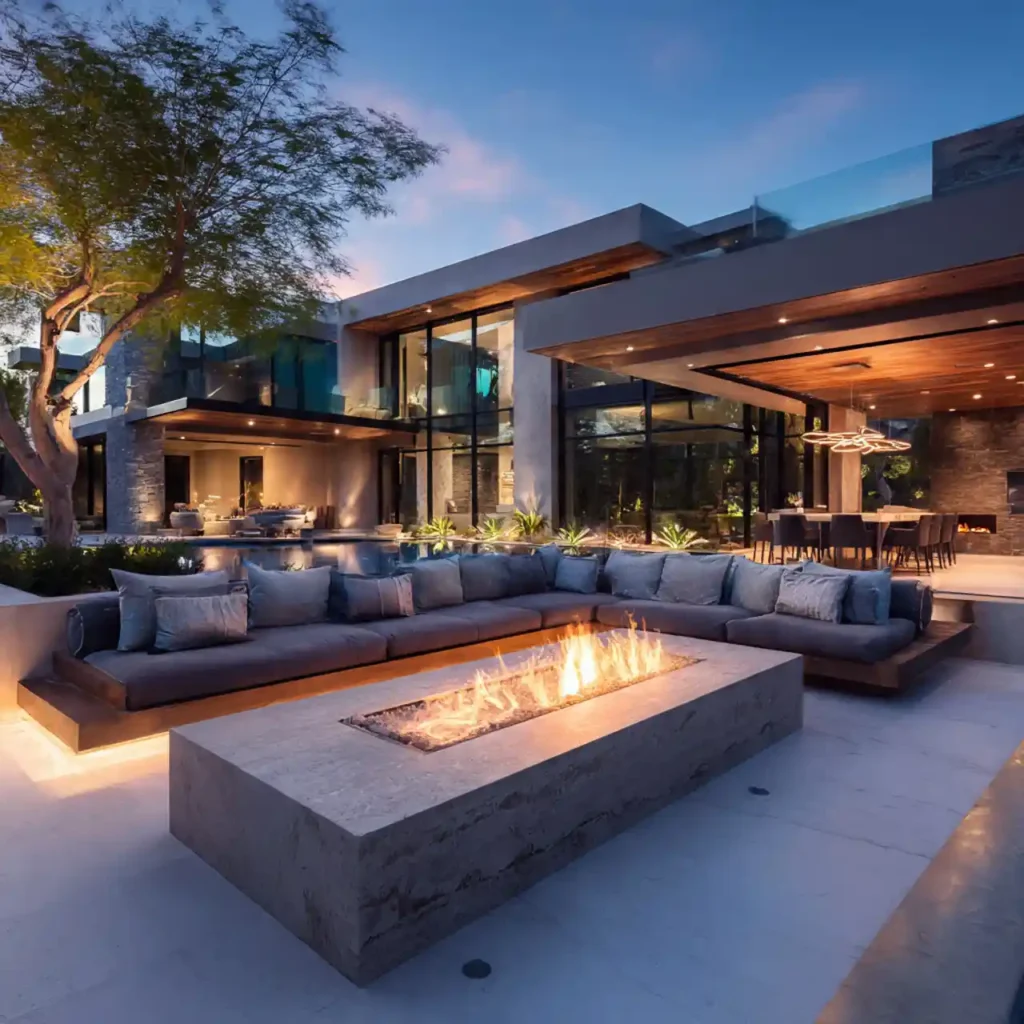 Premium outdoor sofas create a high-end feel. Fire pit tables add warmth and comfort. Elegant lighting improves nighttime appeal. Neutral colors maintain sophistication. This patio design looks luxurious and modern.