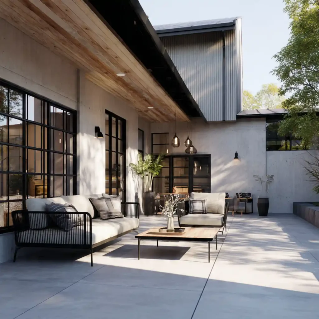 Concrete flooring gives an industrial modern look. Black metal furniture adds bold style. Minimal décor keeps the design clean. Plants balance the hard surfaces. This patio suits contemporary home exteriors.