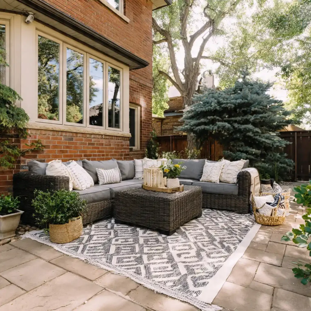 Spacious seating fits the whole family comfortably. Outdoor rugs add softness and warmth. Storage boxes keep toys organized. Safe materials ensure daily usability. This patio supports happy family moments.