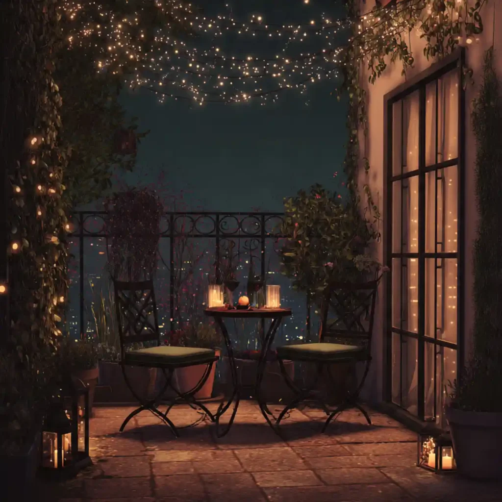 Soft fairy lights create a dreamy atmosphere. A small table setup suits intimate moments. Candles add warmth and elegance. Cozy chairs improve comfort levels. This patio is perfect for quiet romantic nights.