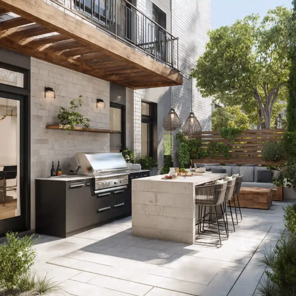 A grill station makes outdoor cooking convenient. Counter space adds extra functionality. Dining furniture completes the setup. Durable materials ensure long-term use. This patio is perfect for food lovers.