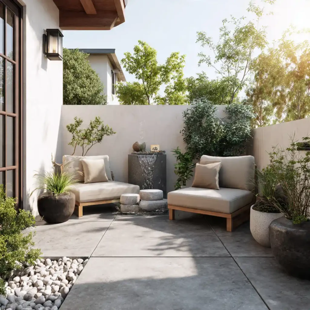 Minimal furniture creates a peaceful environment. Water features add calming sounds. Simple plants enhance relaxation. Neutral colors keep everything balanced. This patio supports mental peace and comfort.