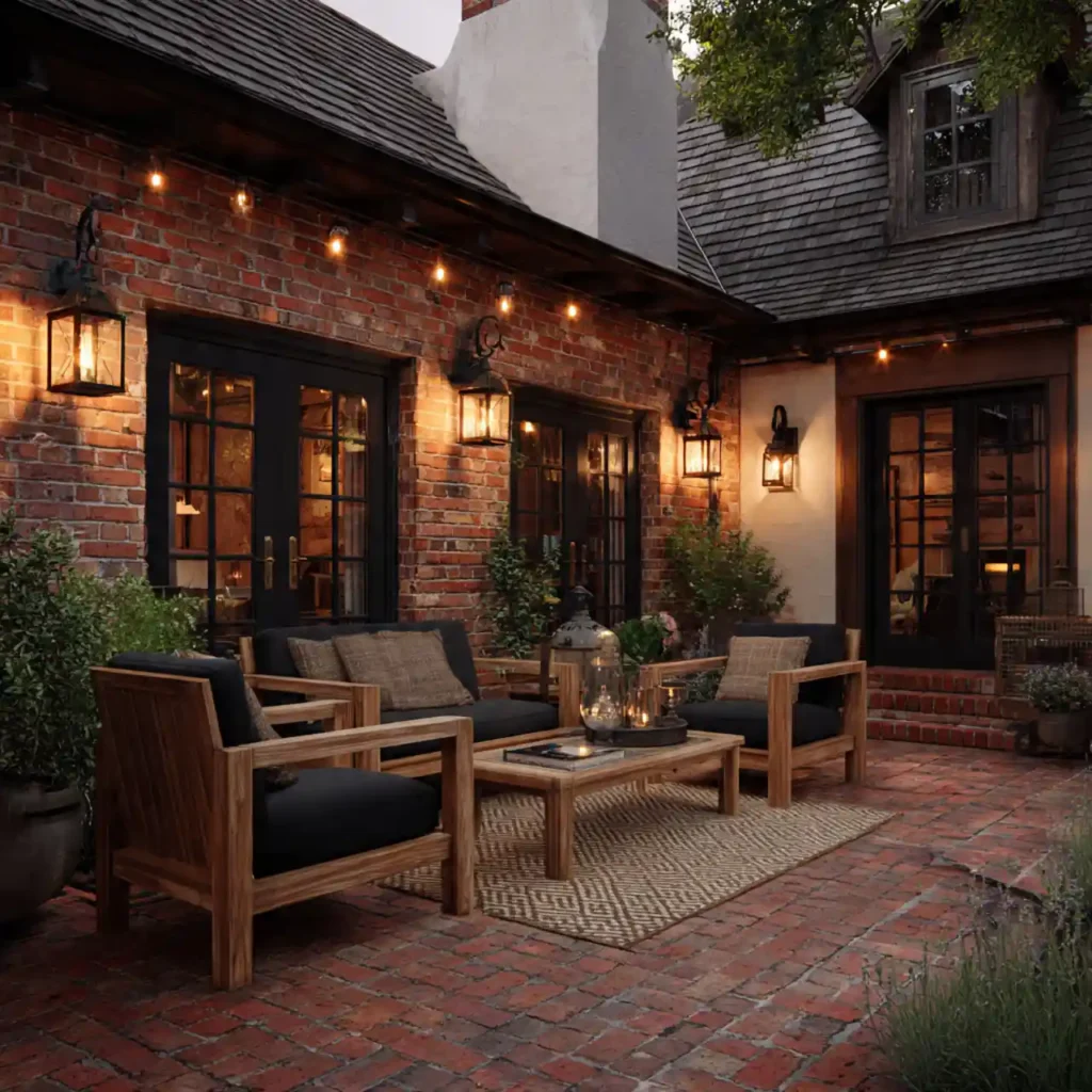 Brick flooring gives a warm traditional look. Wooden chairs complement the rustic style. Soft lighting improves evening charm. Green plants add natural freshness. This patio feels classic and inviting.
