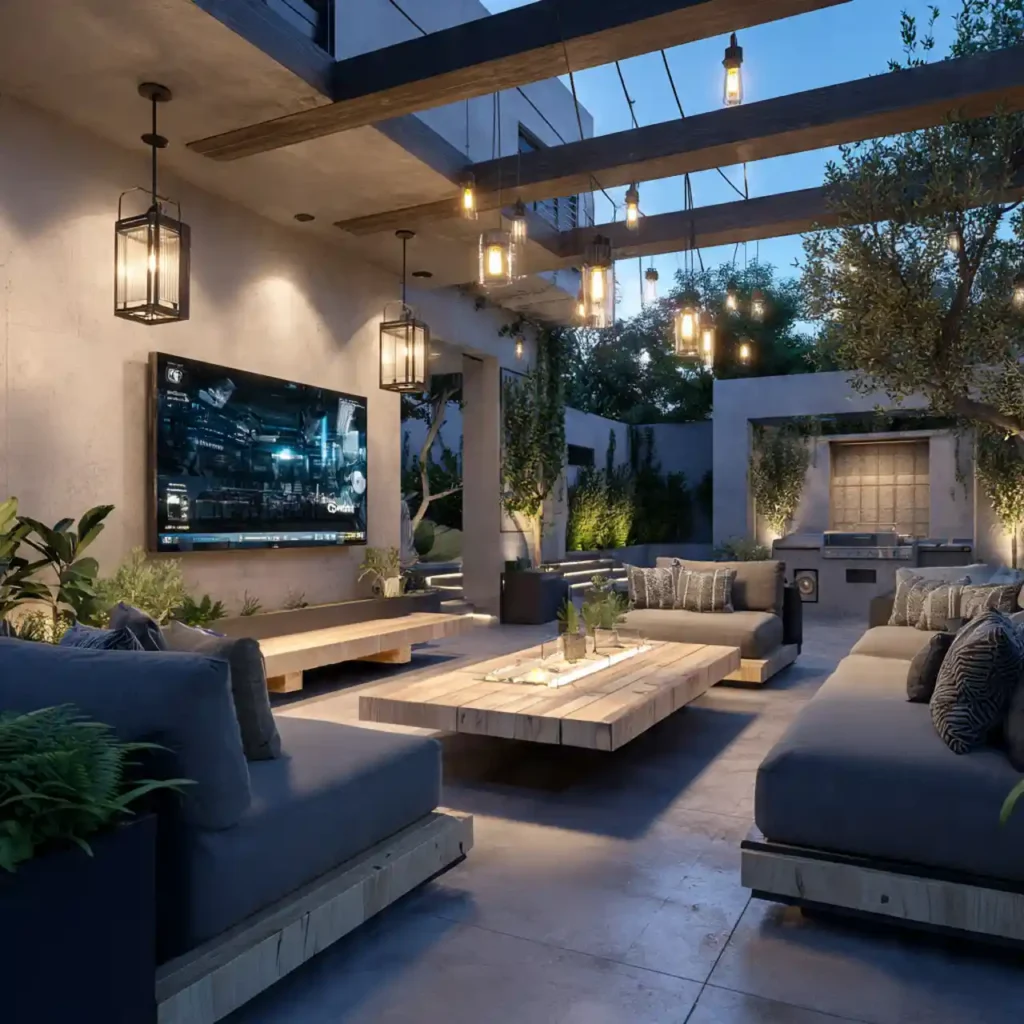 An outdoor TV setup creates fun gatherings. Large sofas provide maximum comfort. Good lighting supports nighttime use. Friends and family enjoy movie nights. This patio is perfect for entertainment lovers.