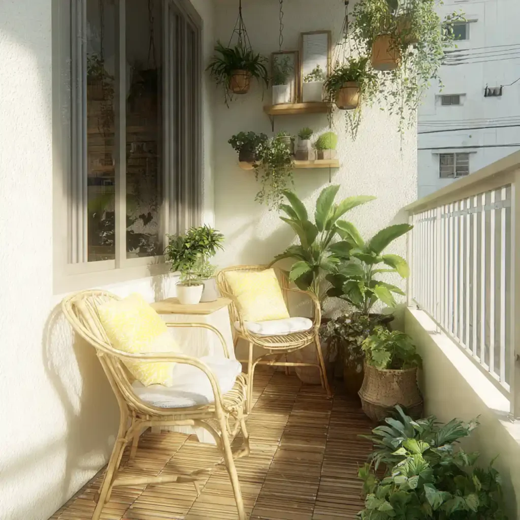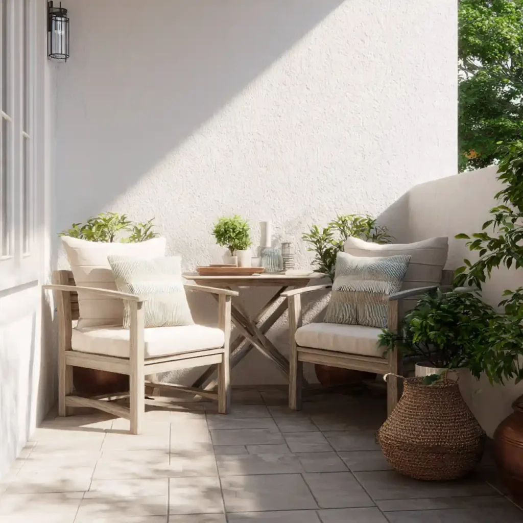 Even balconies can become stylish patios. Small chairs fit perfectly in tight spaces. Hanging plants save valuable floor area. Simple décor keeps the look elegant. This idea works well for apartments.