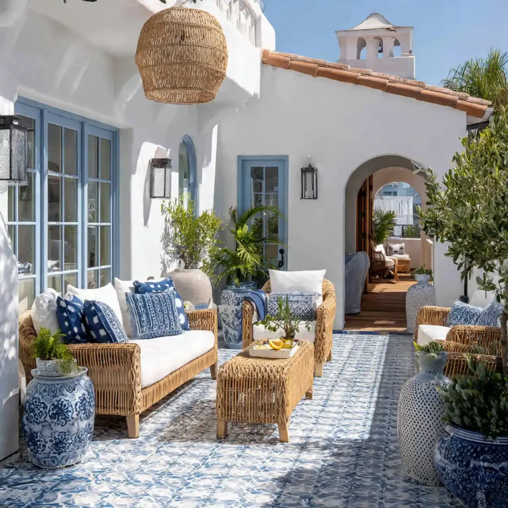 Blue and white colors create coastal beauty. Patterned tiles add decorative charm. Wicker furniture completes the theme. Fresh plants enhance the sunny vibe. This patio feels bright and relaxing.