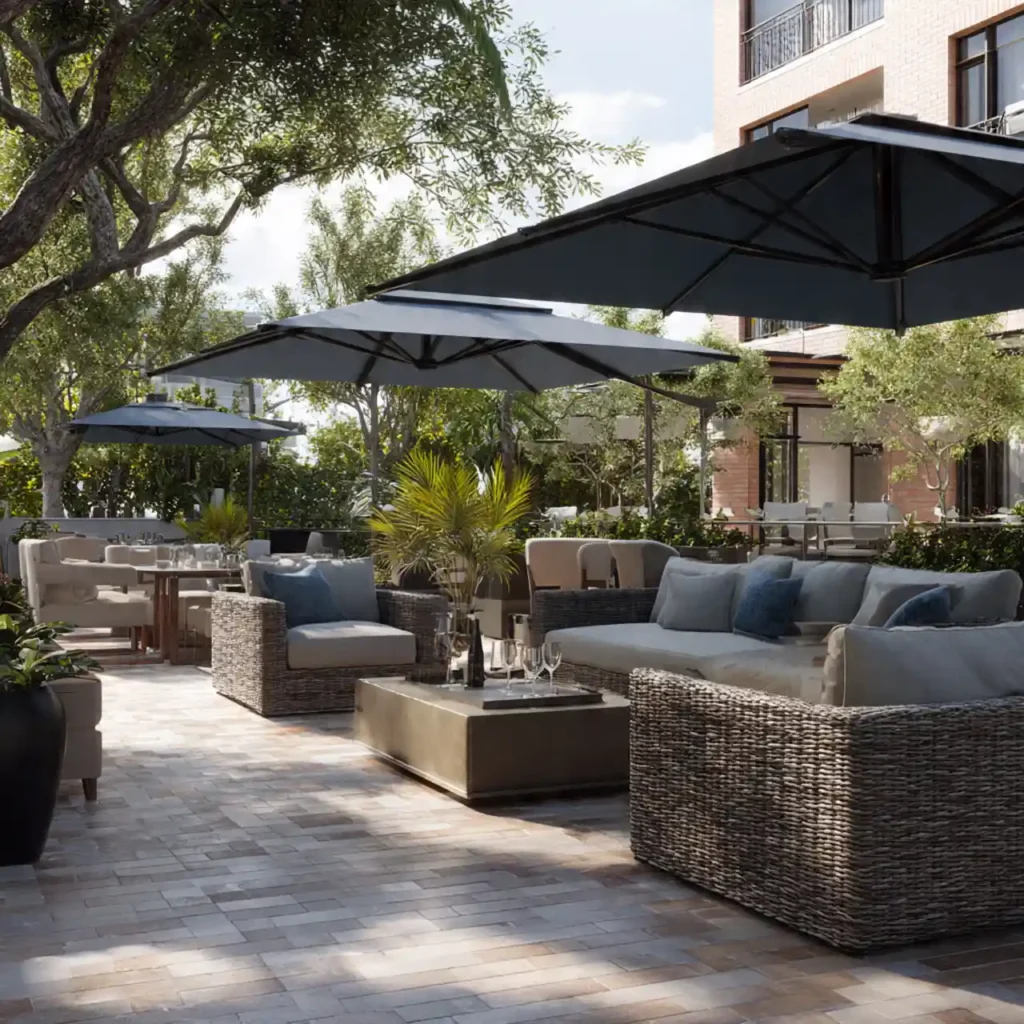 High-quality furniture improves outdoor elegance. Neutral tones keep the design classy. Large umbrellas add comfort and shade. Stylish décor completes the premium look. This patio feels like a five-star resort.