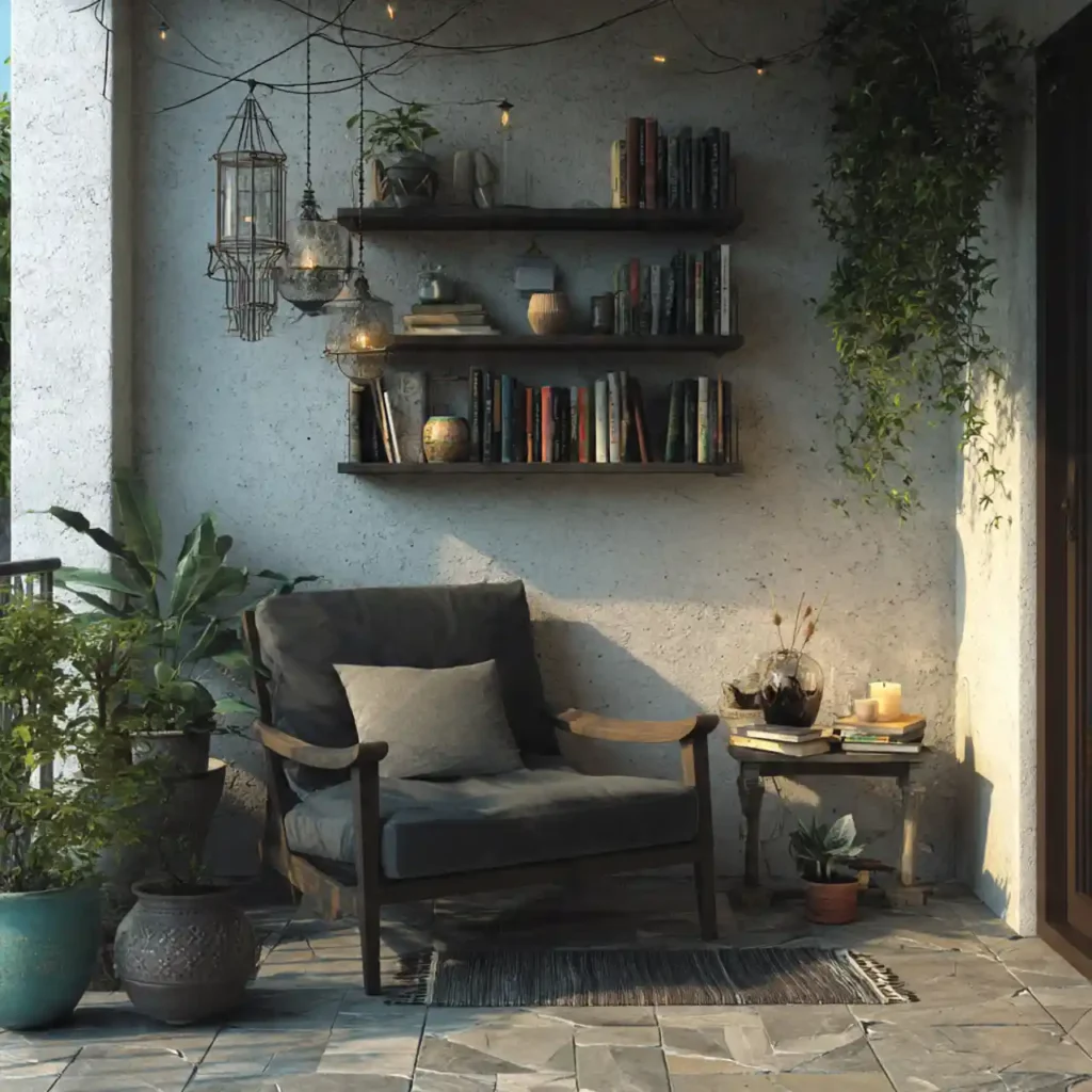 A comfortable chair supports peaceful reading. Small tables hold coffee and books. Soft lighting helps during evenings. Calm surroundings reduce daily stress. This patio is perfect for book lovers.