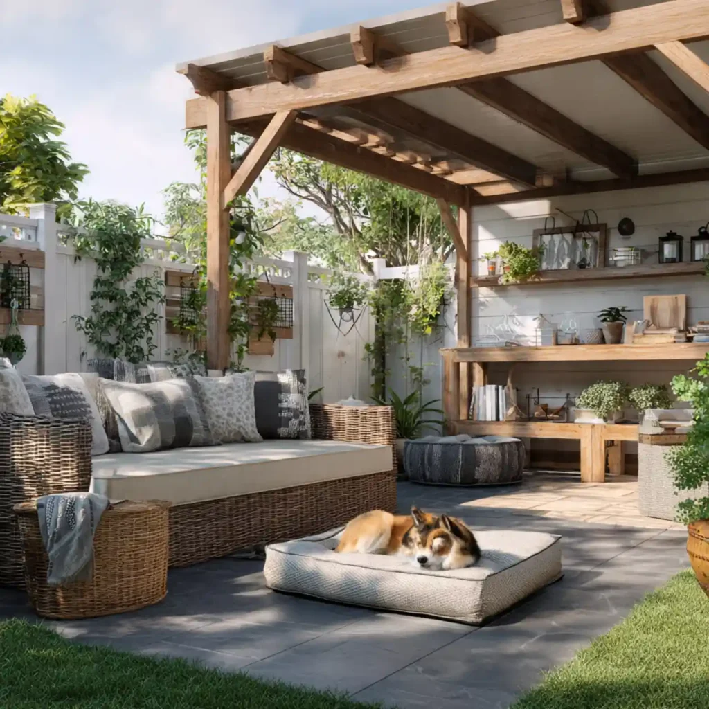 Durable flooring handles everyday pet use. Open space suits pets comfortably. Easy-clean furniture simplifies maintenance. Storage keeps pet accessories organized. This patio works great for pet owners.