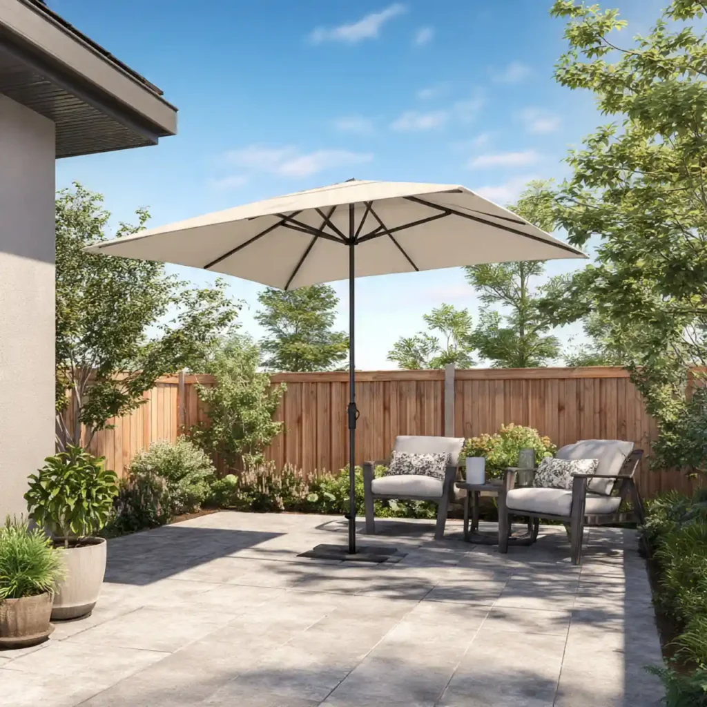 Large umbrellas provide excellent sun protection. Simple seating remains comfortable and practical. Neutral décor keeps the design elegant. Portable furniture adds flexibility. This patio idea is easy and effective.