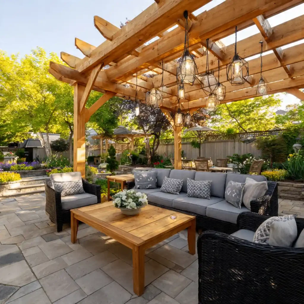 A stylish pergola offers shade and architectural beauty. Wooden beams create a structured and elegant look. Comfortable sofas make the patio inviting and relaxing. Hanging lights enhance the evening ambiance. This idea blends comfort with outdoor luxury.
