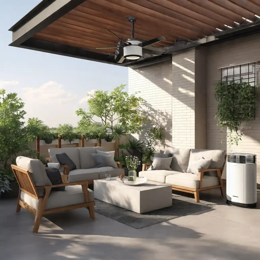 Weatherproof furniture ensures long-term usability. Covered roofs protect from rain and sun. Heaters support comfort in winter months. Fans improve airflow in summer days. This patio works perfectly all year round.
