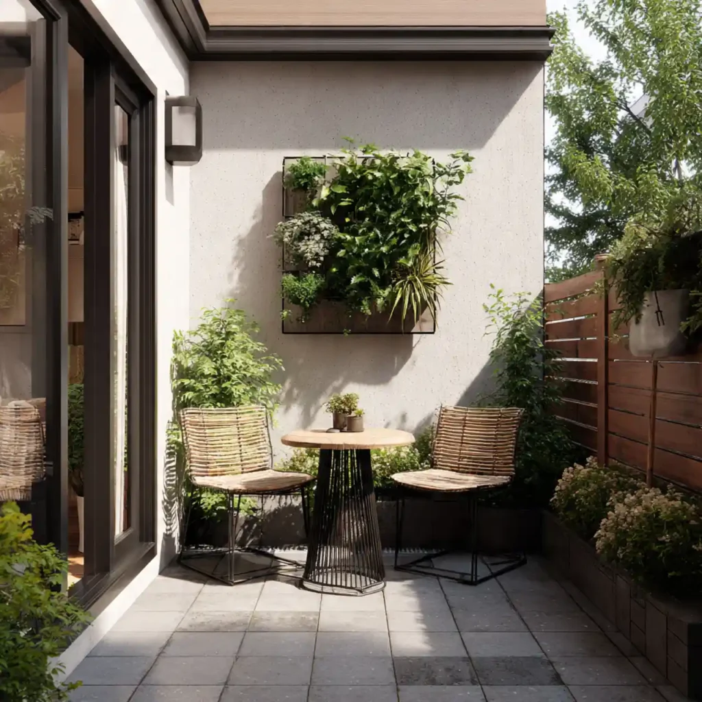 Vertical gardens save space creatively. Plants become the main decorative element. Simple furniture keeps balance in design. Natural beauty improves the atmosphere. This patio idea is eco-friendly and trendy.