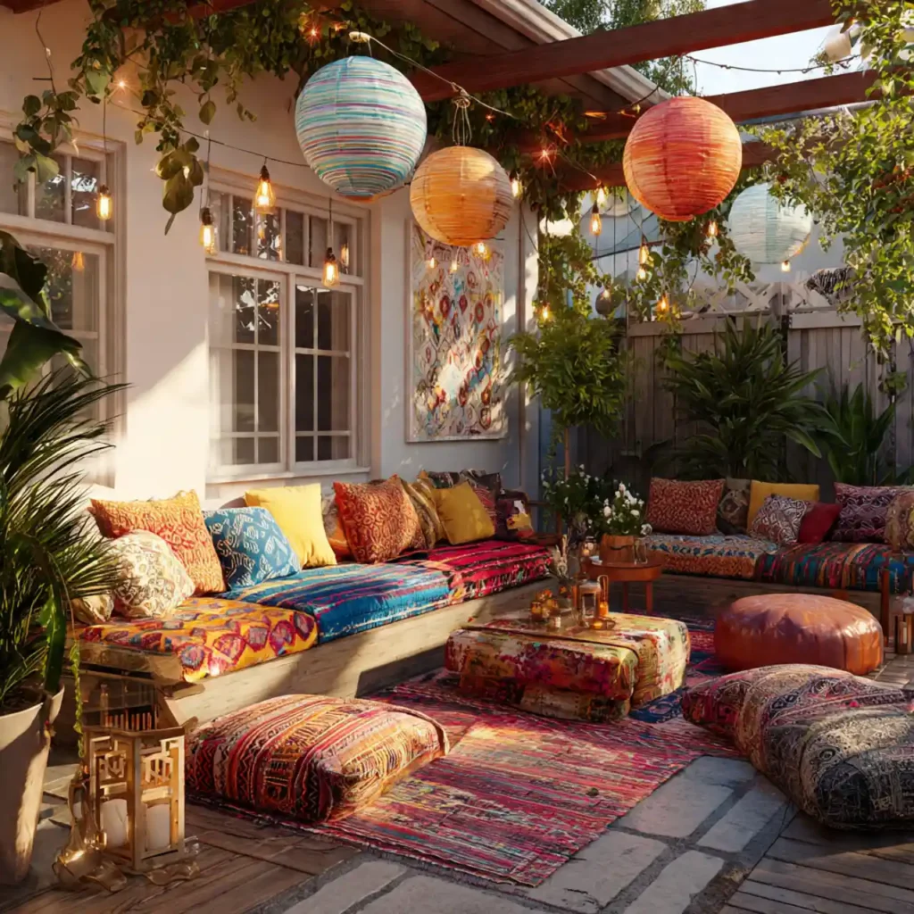 Colorful cushions and patterned rugs create a boho vibe. Natural materials add texture and character. Low seating gives a relaxed and casual feel. Green plants complete the artistic look. This patio feels creative and cozy.