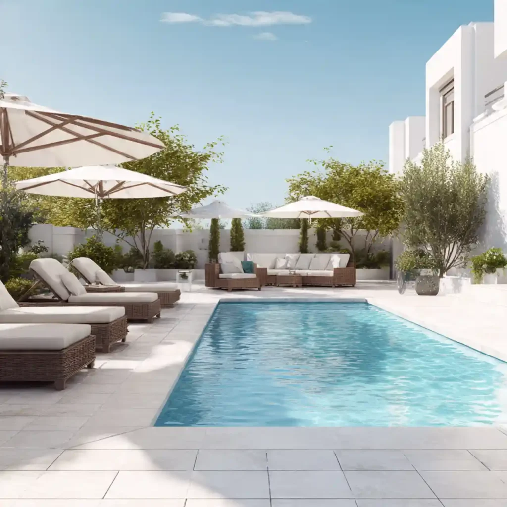 A patio near the pool enhances outdoor relaxation. Sun loungers provide comfort and style. Umbrellas add shade and visual balance. Neutral flooring keeps the design elegant. This setup feels like a private luxury resort.