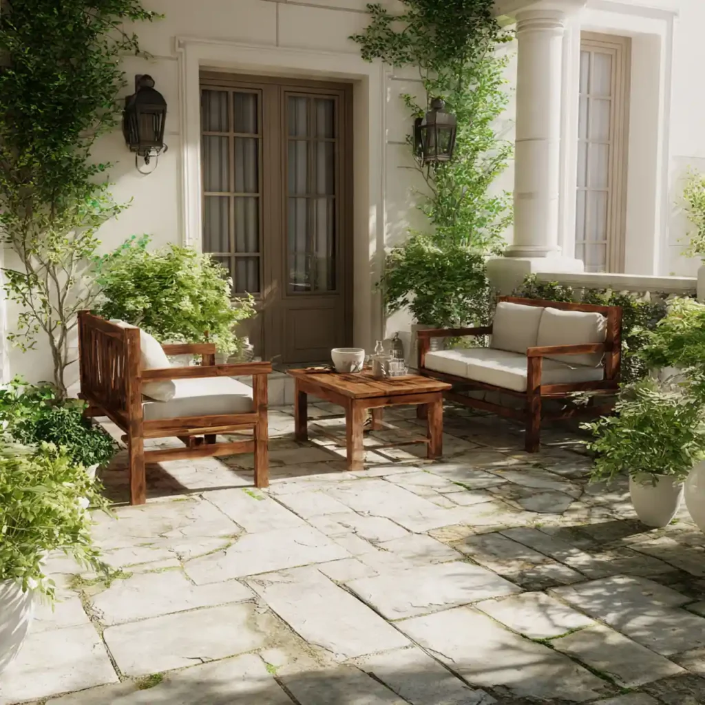 Stone flooring adds a classic and durable touch. Natural textures bring outdoor elegance. Wooden furniture matches beautifully with stone surfaces. Plants soften the overall appearance. This patio design is timeless and sophisticated.