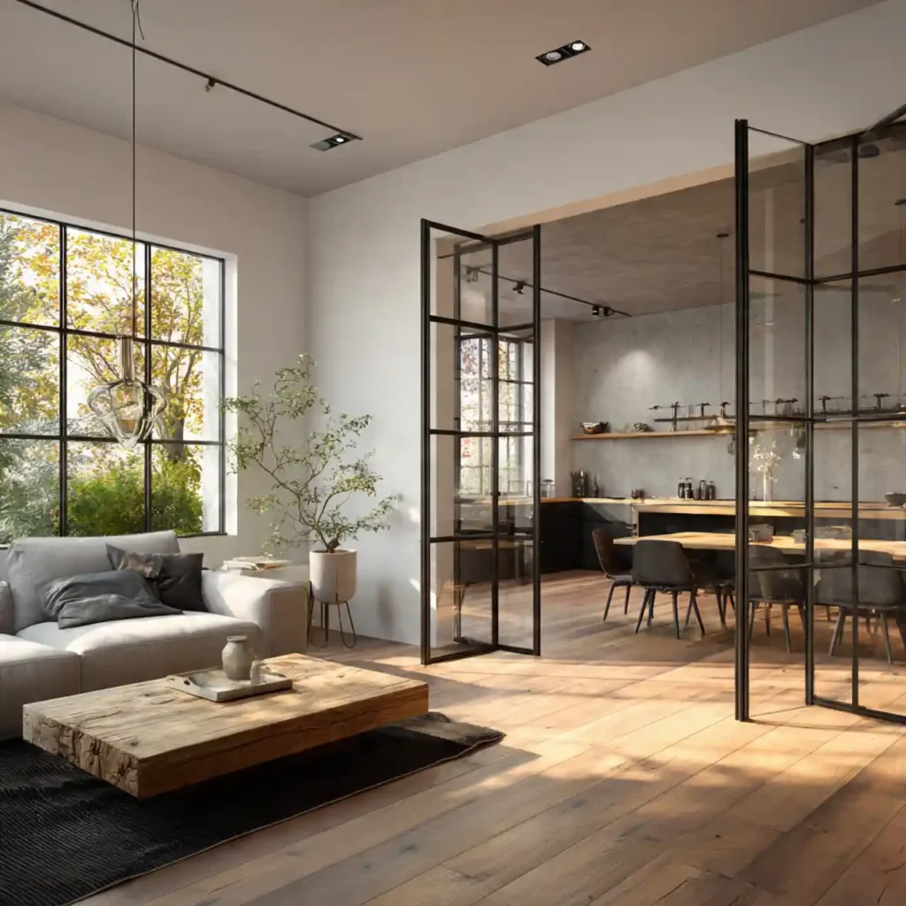 Glass partitions maintain openness while defining separate zones. They allow light to flow freely through the home. Black metal frames create modern industrial appeal. Glass dividers add sophistication without heaviness. This feature balances privacy and openness beautifully.