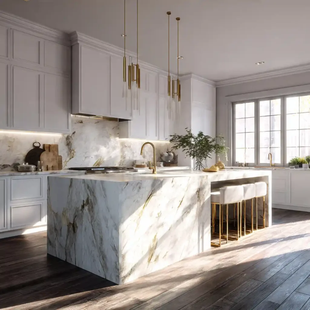 Marble surfaces introduce elegance and natural texture. Large marble kitchen islands or bathroom walls create a luxurious statement. The veining pattern adds organic artistry. Marble instantly upgrades any interior. It combines beauty with timeless appeal.
