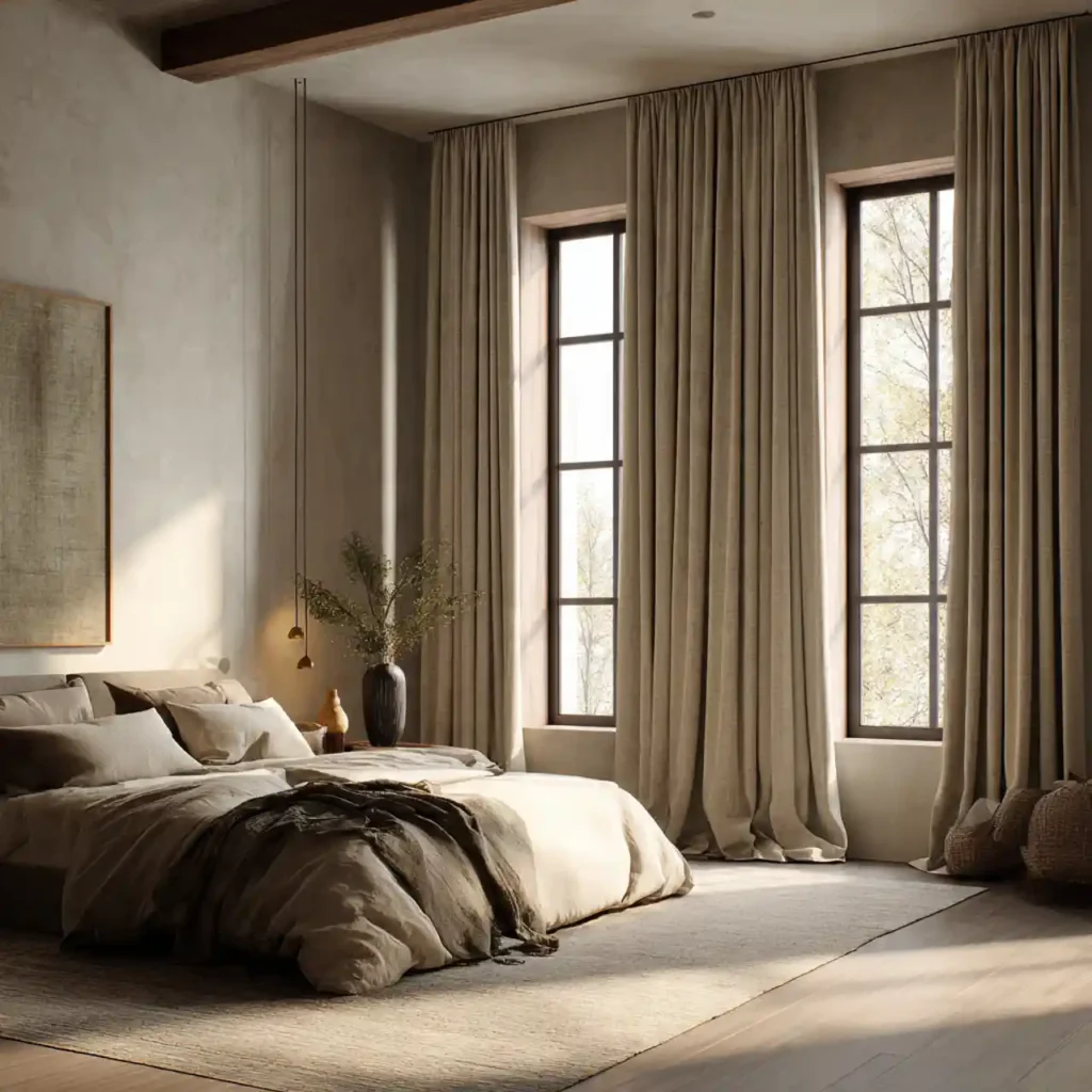 Long, dramatic curtains create vertical emphasis and elegance. They make ceilings appear taller and rooms more refined. Luxurious fabrics like linen or velvet enhance the aesthetic. Floor-length drapery adds softness to modern spaces. It brings both drama and comfort.