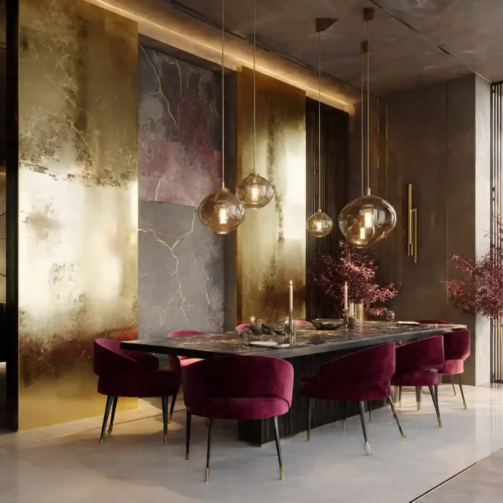 Metal finishes such as brushed brass or textured steel create bold impact. They reflect light and add industrial sophistication. Metallic walls introduce a dramatic contemporary vibe. This feature works well in dining or living areas. It elevates the space instantly.