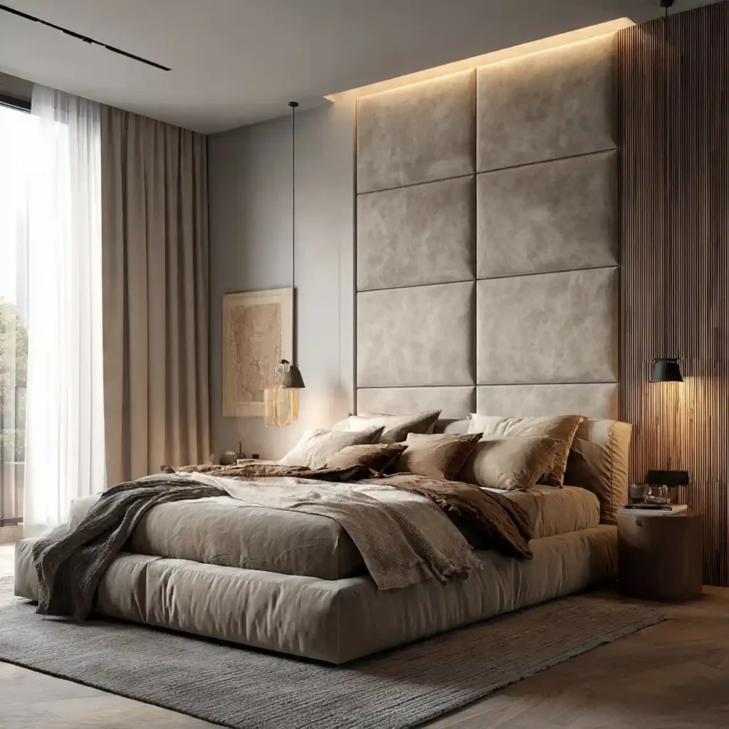 An oversized upholstered or paneled headboard wall creates bedroom drama. It anchors the sleeping space visually. Textured fabrics or wood panels enhance depth. A bold headboard defines the room’s mood. It turns the bed into a centerpiece.