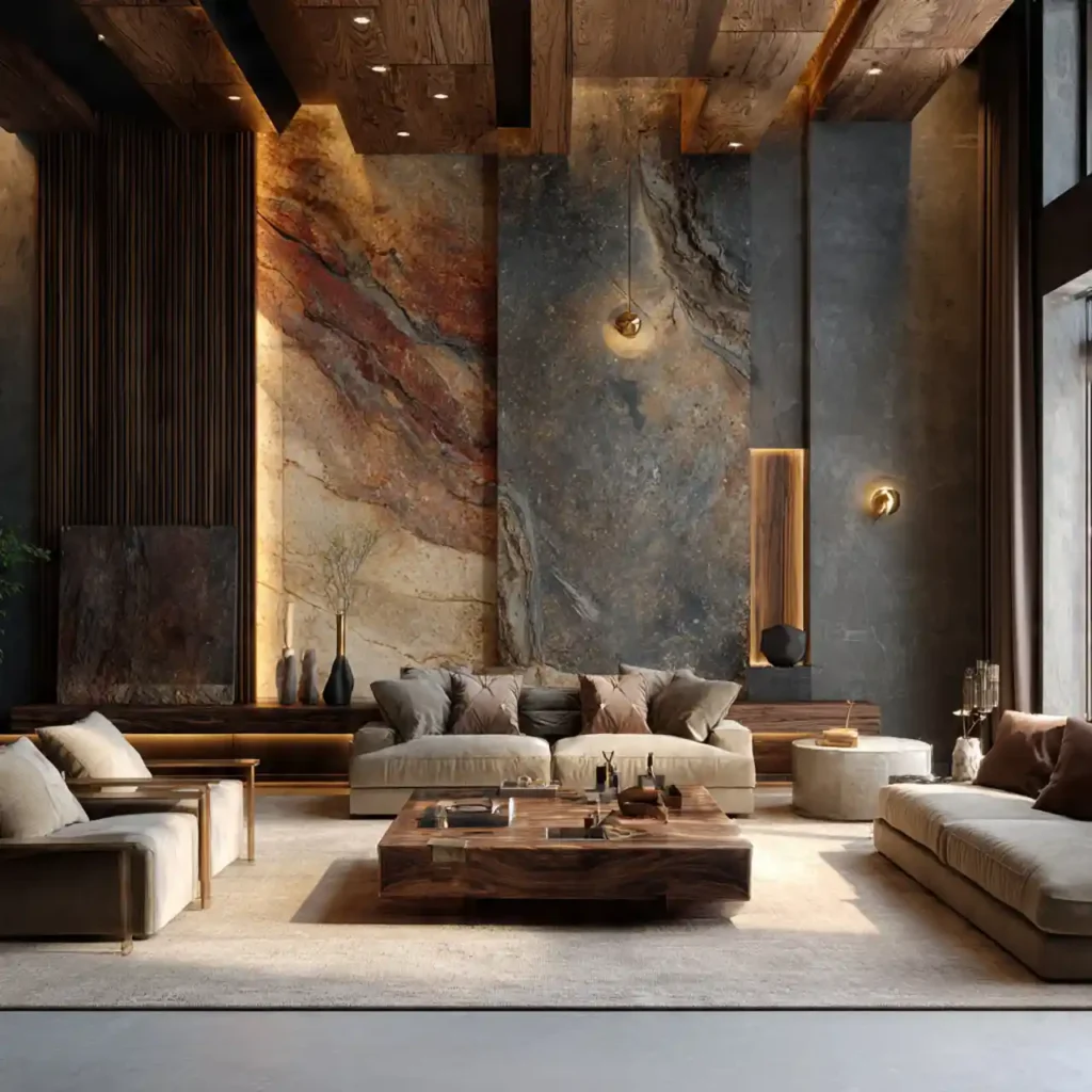Combining wood, stone, and metal in one feature wall creates layered texture. It adds contrast and strong design presence. Mixed materials introduce depth and character. This feature feels custom and architecturally rich. It instantly upgrades plain interiors.