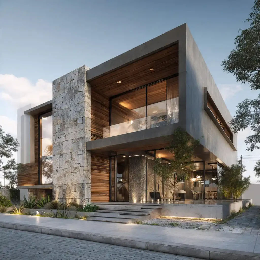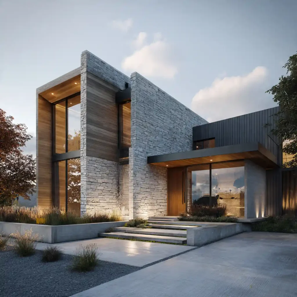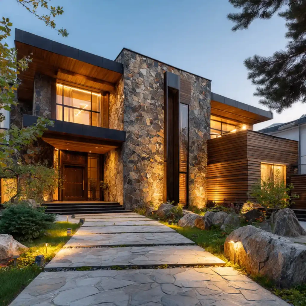 A home with a dominant stone wall and sleek wooden panels creates strong contrast. The textures work together to create depth. Large glass openings make the house feel open and modern. Soft lighting highlights the natural materials. This design feels bold yet timeless.