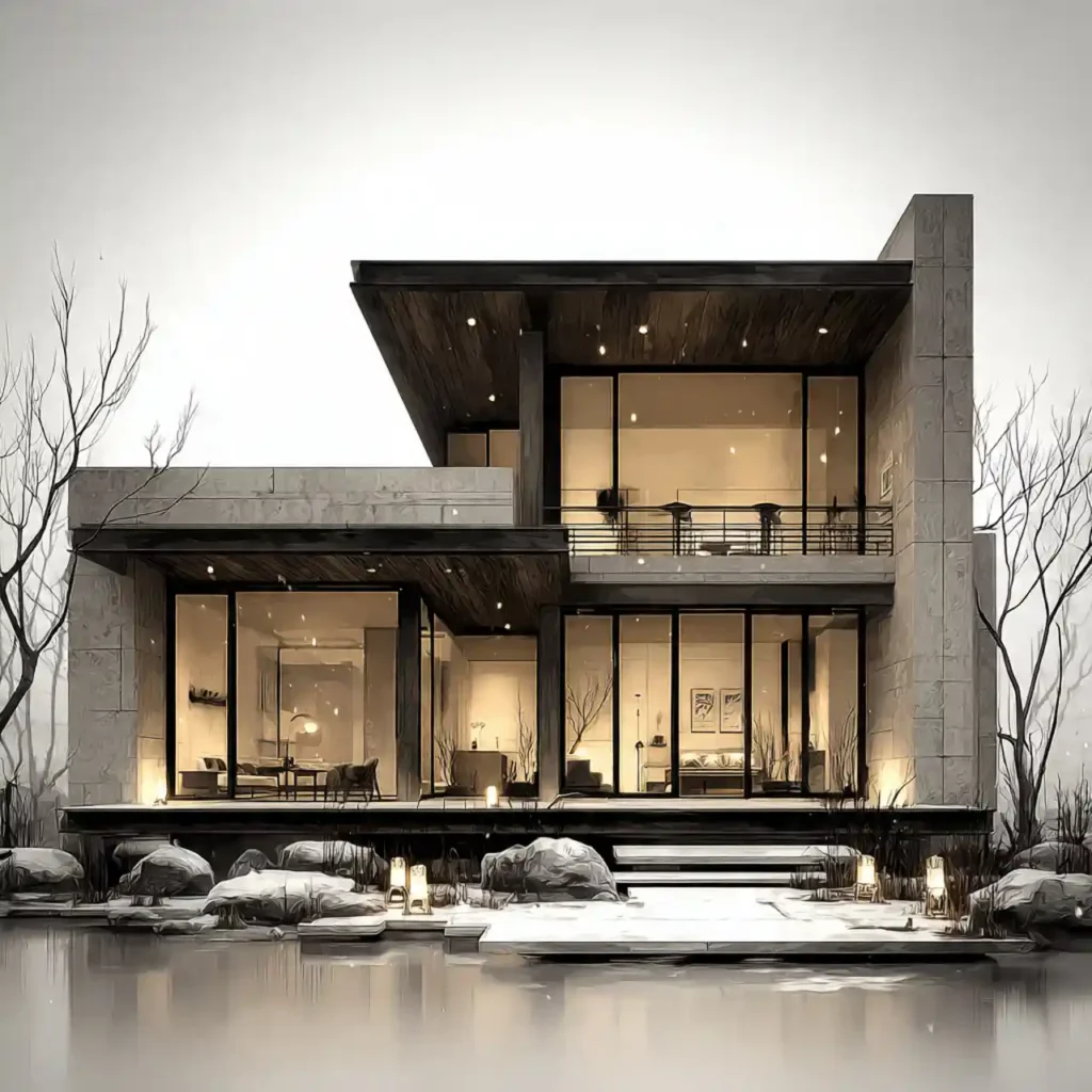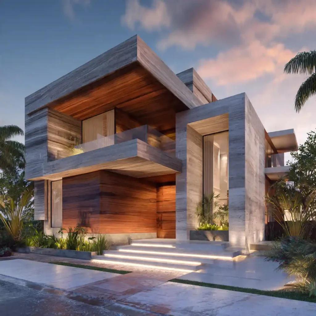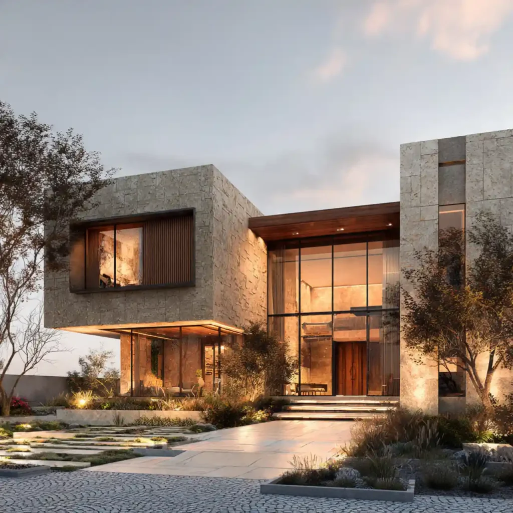A home with a dominant stone wall and sleek wooden panels creates strong contrast. The textures work together to create depth. Large glass openings make the house feel open and modern. Soft lighting highlights the natural materials. This design feels bold yet timeless.