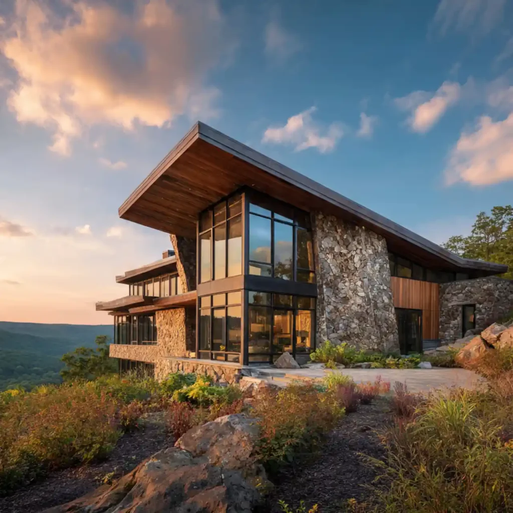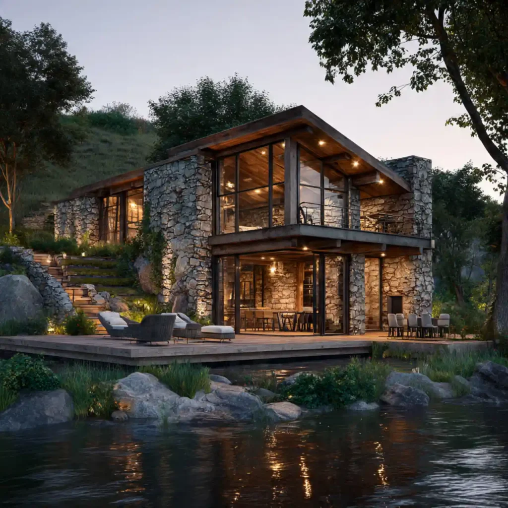 A hillside home built with stone walls and wooden siding blends perfectly with nature. The materials reflect the surrounding landscape. Large windows frame scenic hillside views. Wooden terraces create relaxing outdoor areas. This architecture feels organic and elegant.