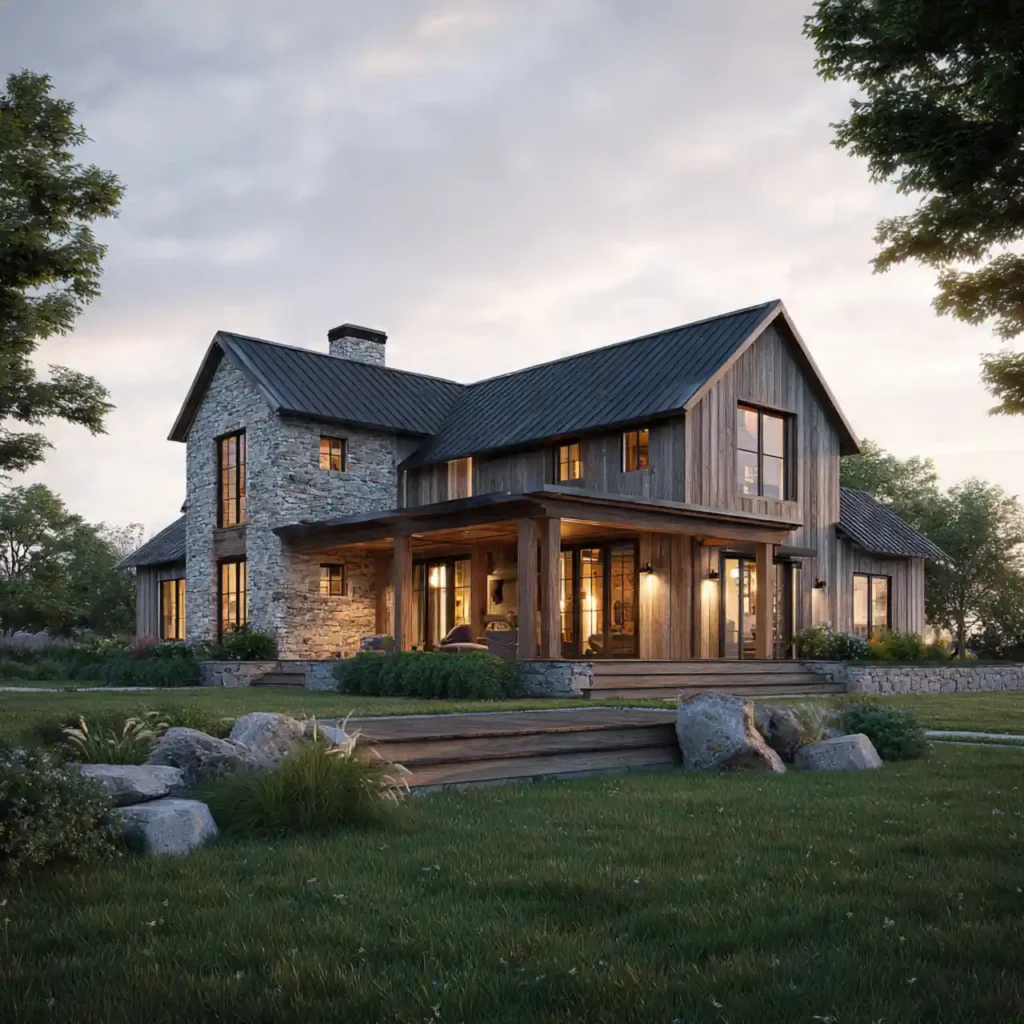 A modern farmhouse with stone walls and wooden siding feels rustic yet refined. The stone gives the home a grounded appearance. Wooden elements add warmth and country charm. Wide windows bring in natural light. This design feels welcoming and elegant.
