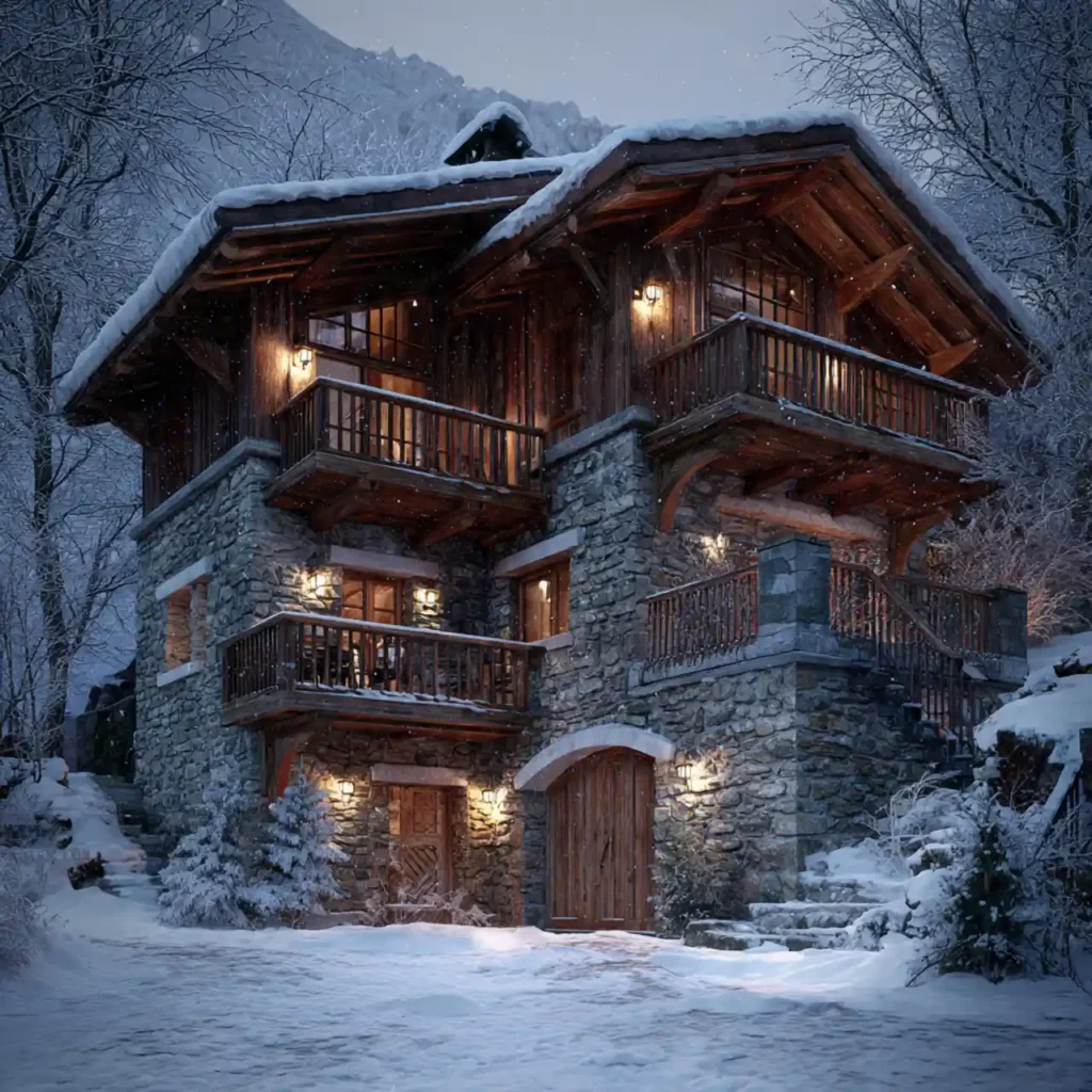 An alpine chalet with a stone base and wooden balconies looks incredibly charming. The stone foundation protects the home in mountain climates. Wooden railings and roofs add warmth to the architecture. Large windows capture snowy landscapes beautifully. This style feels cozy and elegant.
